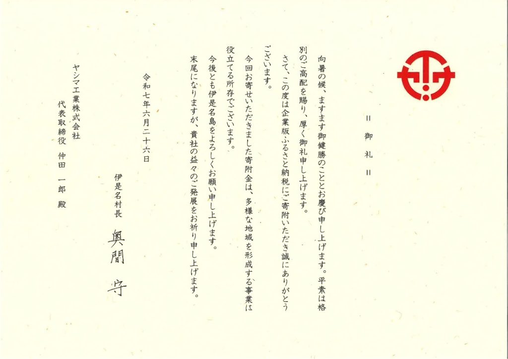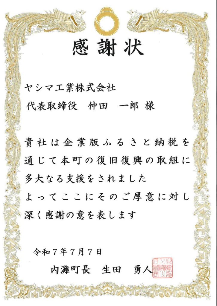この度、当社は地域社会への貢献活動の一環として企業版ふるさと納税を実施し、内灘町ならびに伊是名村より感謝状をいただきました。